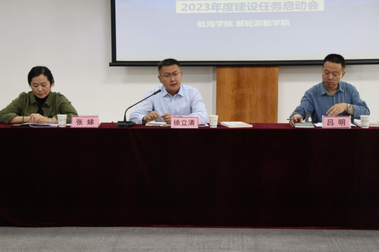 启动仪式上,教务科研处主任张娣宣读了《山东省教育厅关于公布第二批高等职业教育高水平专业群建设项目的通知》、宣读了航海技术高水平专业群建设专家顾问小组、专业群建设工作小组成员名单。吕明副校长作为专业群负责人从高水平专业群立项背景、基本情况、建设主要指标及经费预算、职责分工、验收方式五个维度进行了专业群相关情况介绍。李晓伟副院长依据该专业群在省厅审核备案的专业群建设立项任务书、建设方案从十个方面传达布置了2023年度各项建设任务及落实任务责任分工。