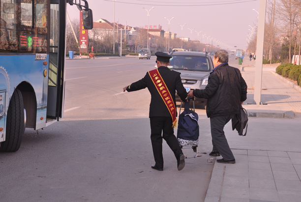图五 航海系“爱心实践团队”成员在辅助老人上车