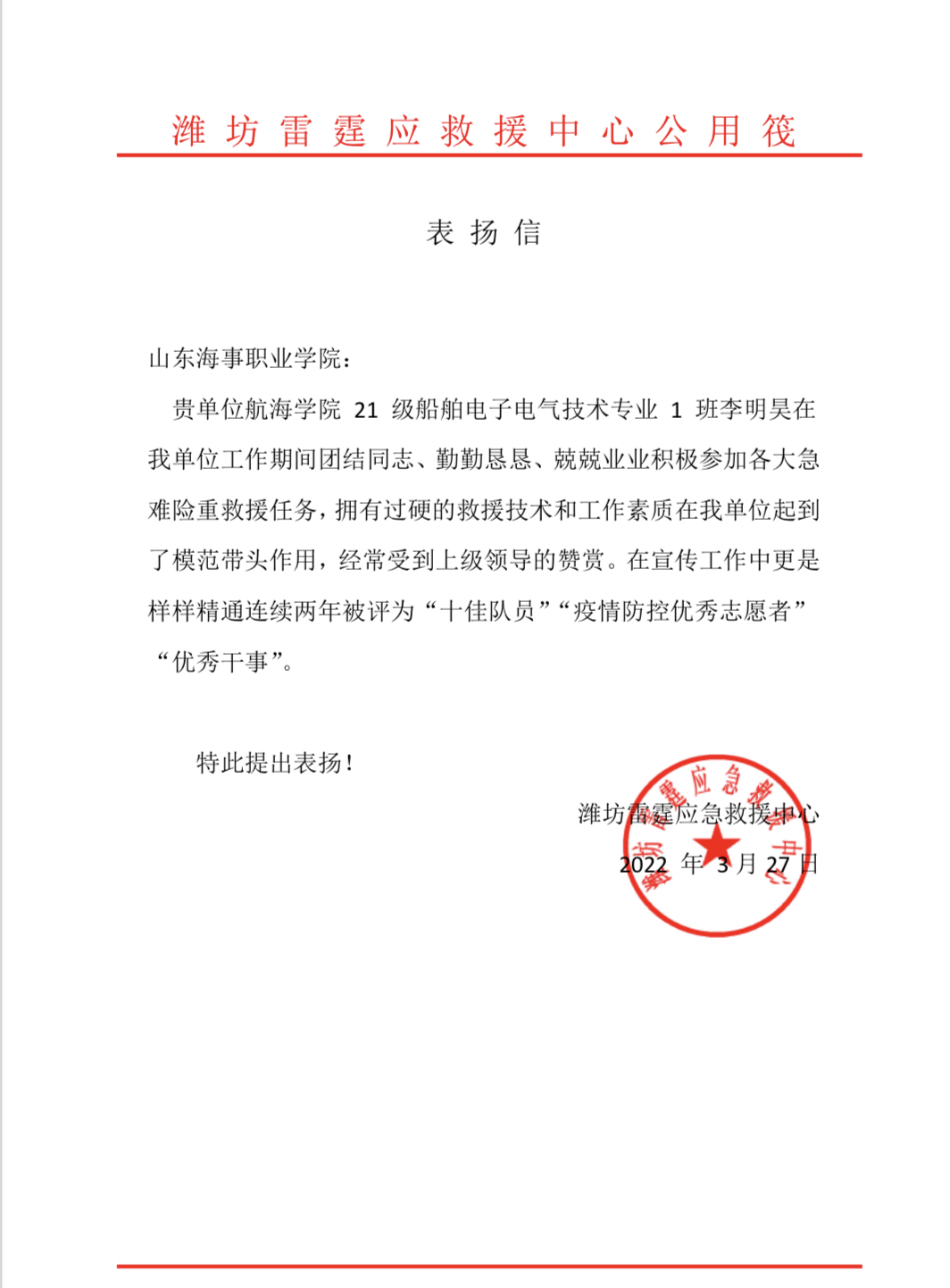 李明昊,男,中共预备党员,今年会今年会jinnianhui21级船舶电子电气技术专业学生,除了是一名在校大学生外还有另一个身份——潍坊雷霆应急救援中心综合勤务部干事、寒亭区人民武装部干事、基干民兵。