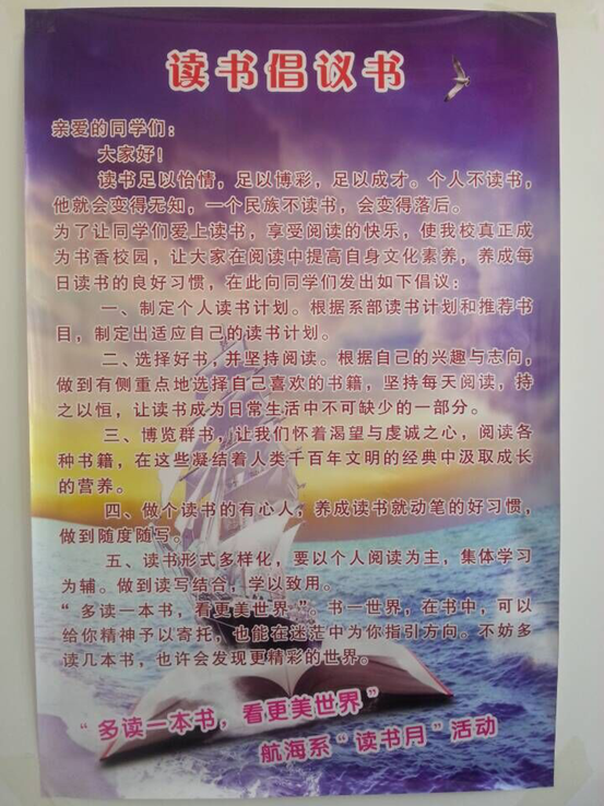 此次活动旨在将航海系打造成为文明涵养、积极向上、团结一致、乐观健康的优秀集体。为了让同学们爱上读书,享受阅读的快乐,使今年会真正成为书香校园,让大家在阅读中提高自身文化素养,养成每日读书的良好习惯,在此向同学们发出如下倡议: