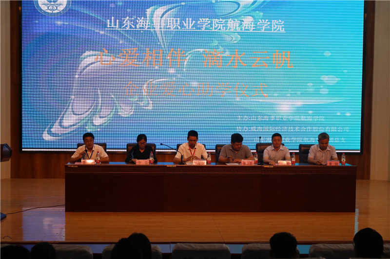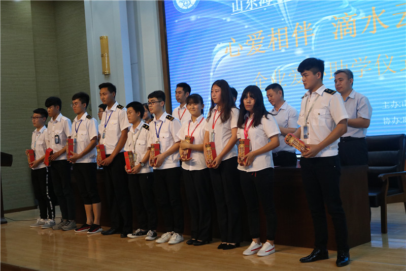 此次献爱心助学仪式以“心爱相伴 滴水云帆”为主题,仉继航院长作为校方代表将近年来学院的办学情况做简短介绍,阐述了本次助学仪式的重大意义,并对威海国际经济技术合作股份有限公司给予的帮助表示衷心的感谢。张卫忠副总经理介绍了公司业务及船员生活,并欢迎同学们毕业后到公司就职。2017级学生张苗苗代表受助学生上台讲话,表达了对企业和学院的感谢。最后,公司领导和学院领导向受助学生颁发了威海国际经济技术合作股份有限公司提供的爱心用品。