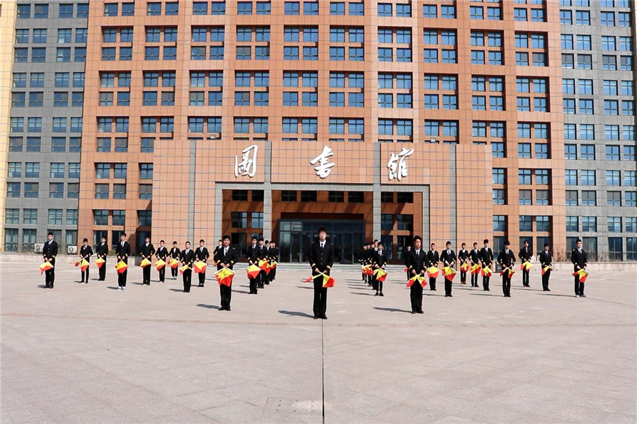 活动开始,航海学子们身着学院制服、佩戴航海肩章,挥舞起“红黄相间”的手旗,用国际航海旗语打出了“保卫蓝色国土,维护海洋权益;发展蓝色科技,振兴海洋文化;人海和谐,兴我家邦”的字样,以海员特有的方式来迎接“国际航海日”的到来。