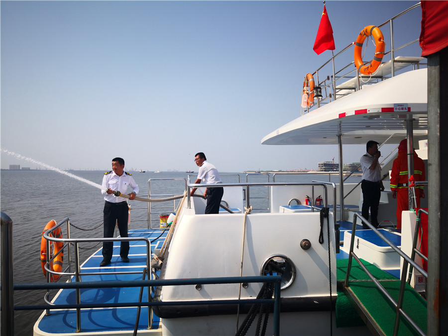 此次消防演习的地点设在滨海旅游集团鲲鹏3号游艇,现场模拟了船舶机舱失火后的应急消防。伴随着短声一分钟接四长声的消防警报,各船员迅速就位,模拟了在船舶机舱失火情况下,如何开展消防应急、旅客疏散等应急应变项目。