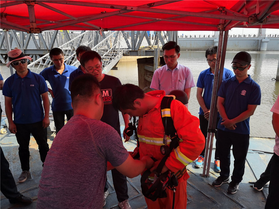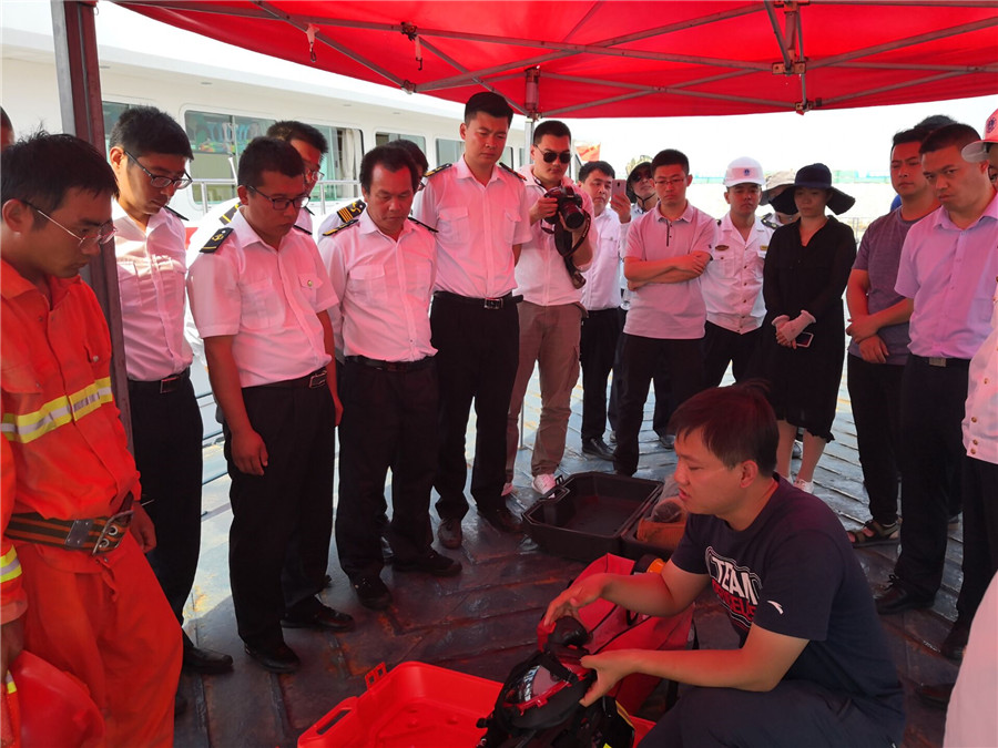 演习结束后,港区海事处主要领导、交通局负责同志和航海学研许亮院长分别对本次演习的情况进行了点评,邀请我院张岳华老师和丁浩老师针对演习过程中暴露的问题和消防员装备的使用,展开了一场“现场教学”,并邀请滨海旅游集团相关同志现场佩戴使用,现场反响热烈!