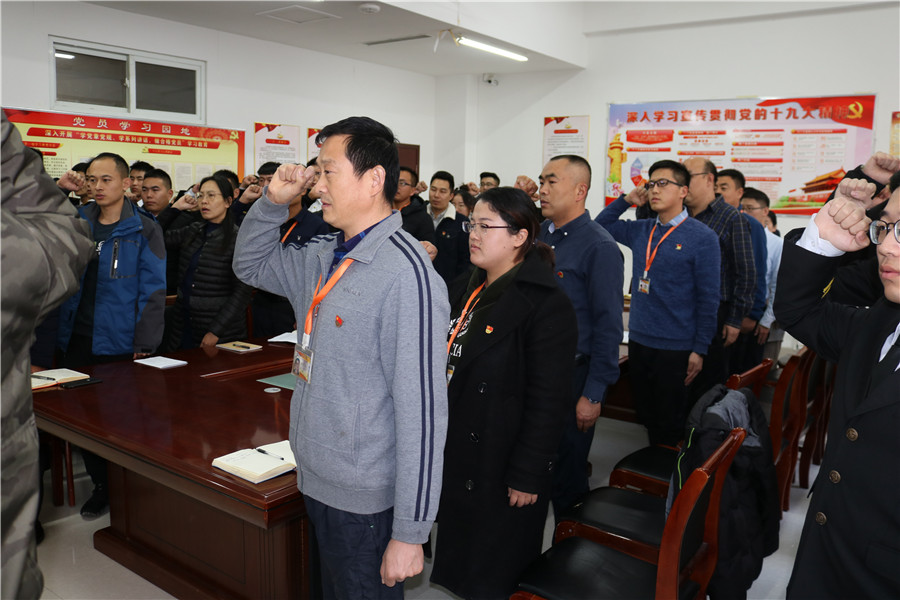 仪式在雄浑激昂的《国际歌》歌声中拉开序幕。组织委员张建军同志宣读今年会jinnianhui2019年新发展党员名单。随后,宣传委员赵传浩同志带领新一期全体预备党员进行宣誓,在鲜红的党旗下,每个人怀着激动的心情,紧握右拳,铿锵有力地宣读入党誓词,深切地表达了对党的无限忠诚,坚定了宣誓人永远为共产主义事业奋斗终身的决心。。