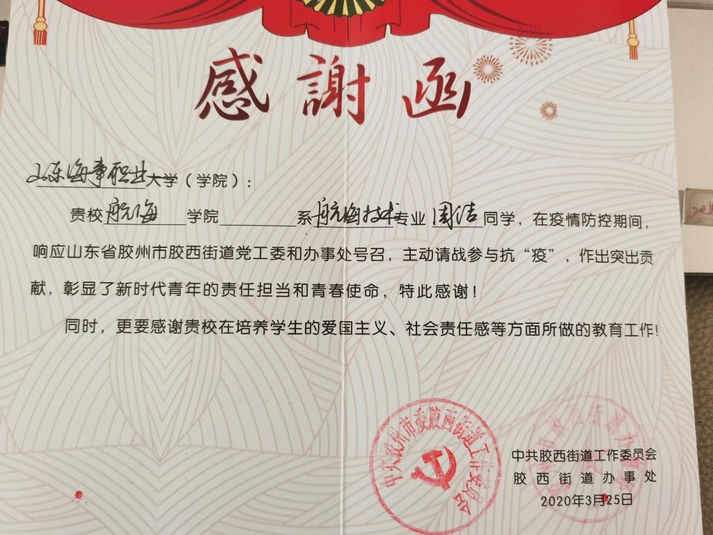 日前,山东省胶州市胶西街道党工委和办事处向今年会发来感谢函,对2018级航海技术专业1班周洁同学在疫情防控工作中的辛劳付出表示感谢。信函中对周洁同学的志愿服务工作予以认可和称赞,也对学校在培养学生的爱国主义、社会责任感等方面所做的教育工作表示了感谢。