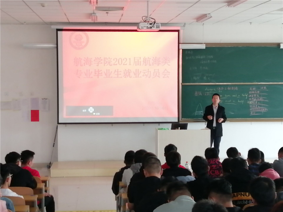 动员会上,吕副校长结合当前就业形势首先运用大数据对今年全国航海类专业毕业生情况作了分析,指出了航海类专业毕业生在全国大学生就业市场中面临的机遇和挑战,并以自身的求学和工作经历激励学生们做好切合实际、适合自己的职业生涯规划。面对疫情下严峻的就业形势,吕副校长对今年的就业工作提出三点要求:第一,希望毕业生们不忘初心、牢记使命,坚定励志远洋、扬帆起航的决心;第二,养成良好的学习、工作和生活习惯,好的习惯对自己的身体、家庭和事业都是最好的保障;第三,希望参加海船船员适任考试的同学在最后的冲刺阶段不放松、不放弃,坚定信念、提升信心,努力考取适任证书;提前跟岗实习的学生要增强自信,利用跟岗实习阶段的学习和锻炼,磨砺意志、提高能力,争取在能够早日顶岗实习并就业。接着刘继峰老师对今年毕业生在考证复习和选择企业等方面给学生做了详细的讲解,告知学生不要盲目选择,要对照自己的实际情况选择企业。