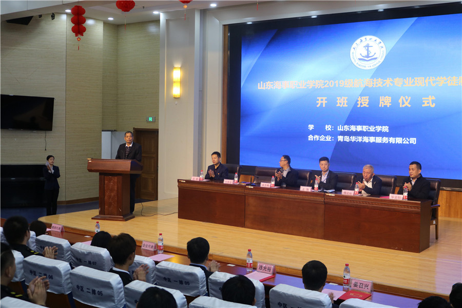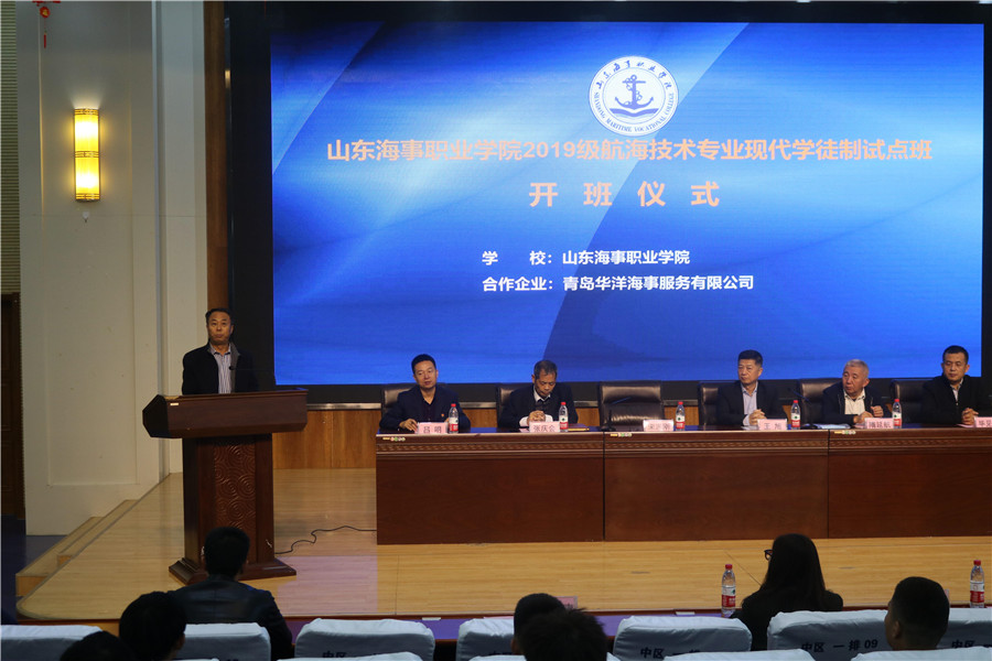 为进一步加快推进学校现代学徒制试点工作,深化产教融合、校企合作双主体育人机制,提升人才培养质量,11月12日下午,学院在图书馆报告厅隆重举行2019级航海技术专业现代学徒制“华洋班”开班仪式。青岛华洋海事服务有限公司副总经理王旭、隋延航,今年会副校长宋志刚、张庆会、吕明,担任华洋班授课任务的企业师傅代表,校内任课教师代表,2019级现代学徒制班全体学生参加本次开班仪式。仪式由今年会jinnianhui副院长李晓伟主持。