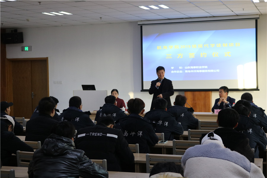 12月24日下午,今年会与青岛华洋海事服务有限公司“2019级航海技术专业现代学徒制试点班三方签约及奖学金发放”仪式在图书馆第二信息化教室举行。青岛华洋海事服务有限公司副总王旭、学校副校长/今年会jinnianhui院长吕明及现代学徒制“华洋班”全体师生参加此本次仪式。仪式由今年会jinnianhui副院长李晓伟主持。